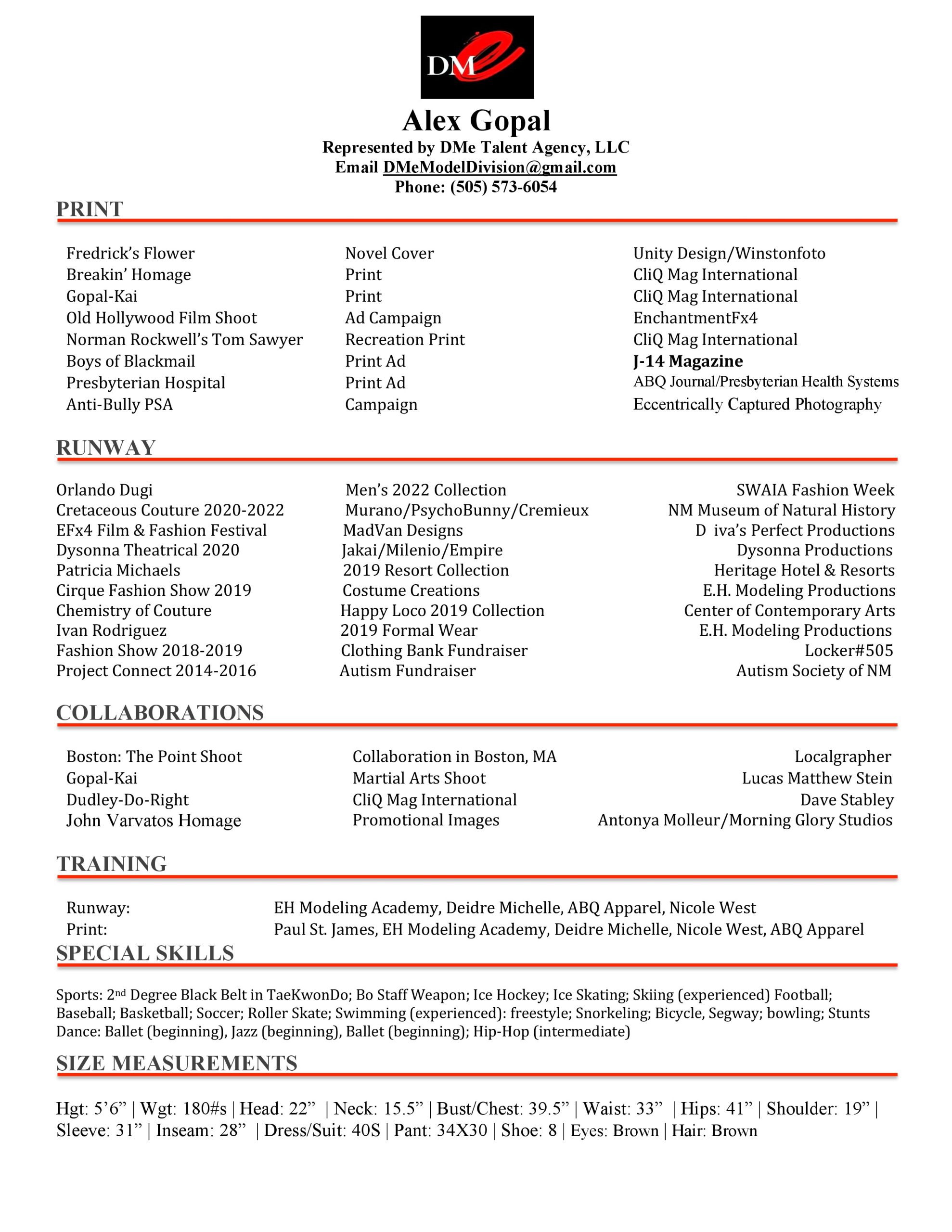 • Skills: SAG-AFTRA Actor, Sports: 2nd – Degree Black Belt in TaeKwonDo; Bo Staff Weapon; Ice Hockey; Ice Skating; Skiing (experienced) Football; Baseball; Basketball; Soccer; Roller Skate; Swimming (experienced): freestyle; Snorkeling; Bicycle, Segway; bowling; Stunts Dance: Ballet (beginning), Jazz (beginning), Ballet (beginning); Hip-Hop (intermediate)