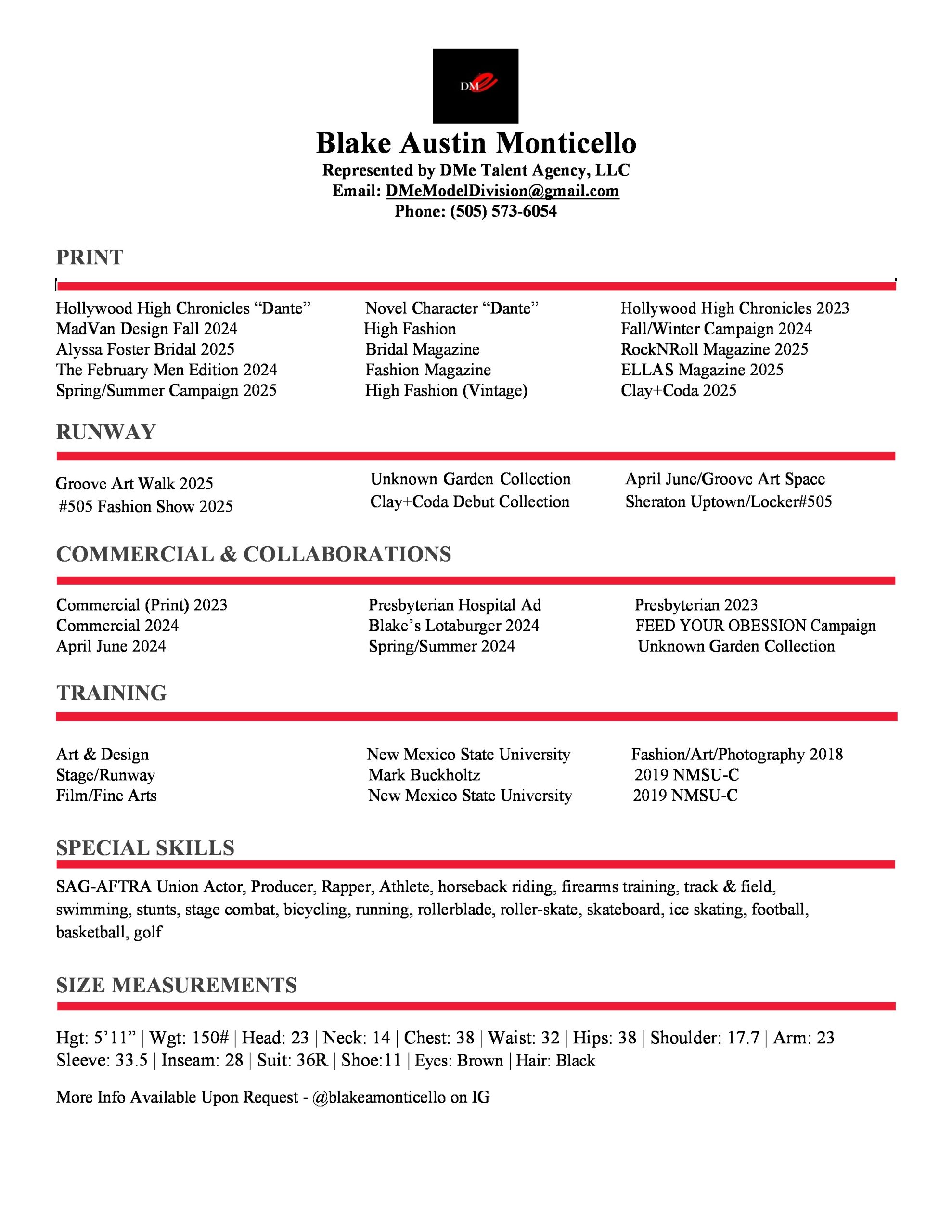 - Skills: SAG-AFTRA Union Actor, Producer, Rapper, Athlete, horseback riding, firearms training, track & field, swimming, stunts, stage combat, bicycling, running, rollerblade, roller-skate, skateboard, ice skating, football, basketball, and golf