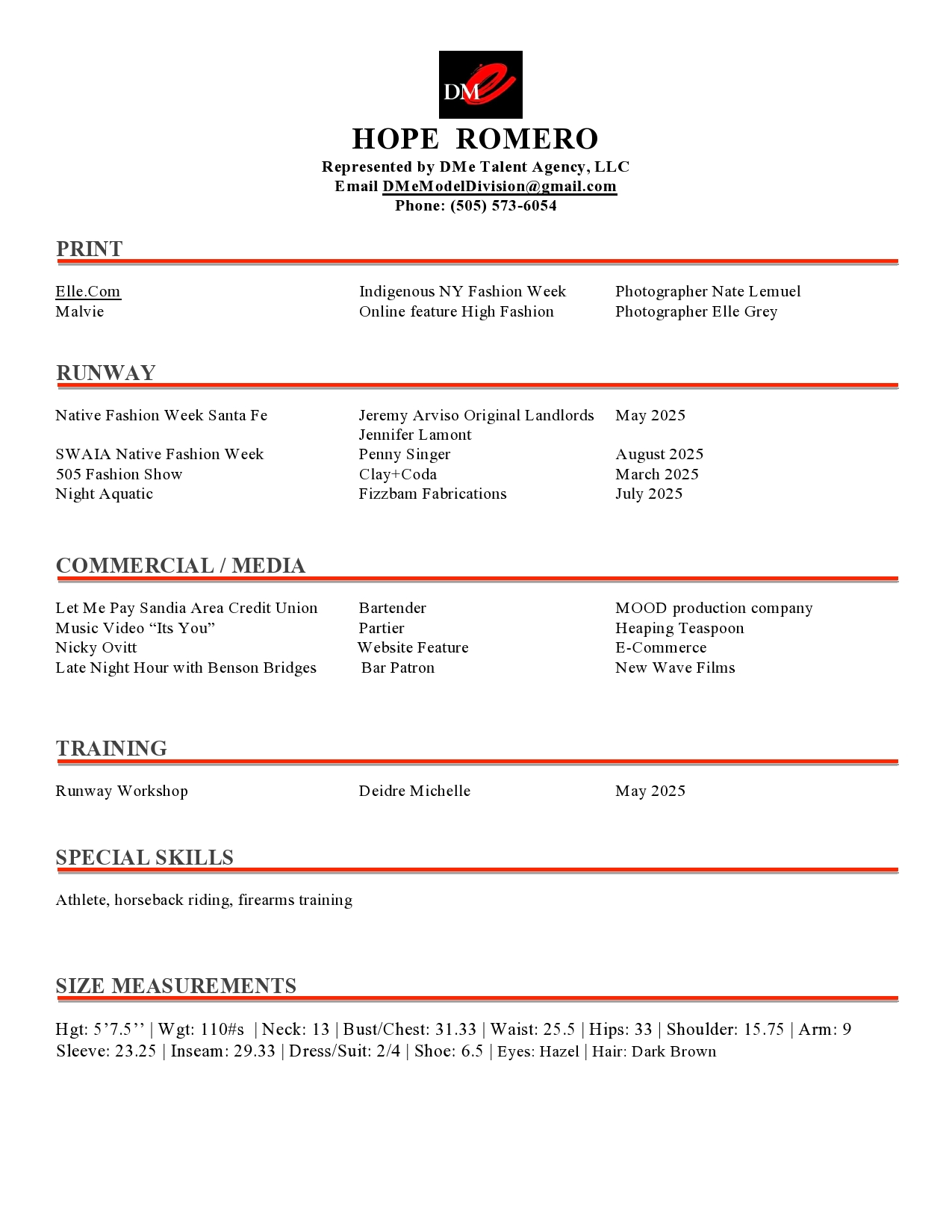 - Hgt: 5’7.5’’ | Wgt: 110#s | Neck: 13 | Bust/Chest: 31.33 | Waist: 25.5 | Hips: 33 | Shoulder: 15.75 | Arm: 9 Sleeve: 23.25 | Inseam: 29.33 | Dress/Suit: 2/4 | Shoe: 6.5 | Eyes: Hazel | Hair: Dark Brown