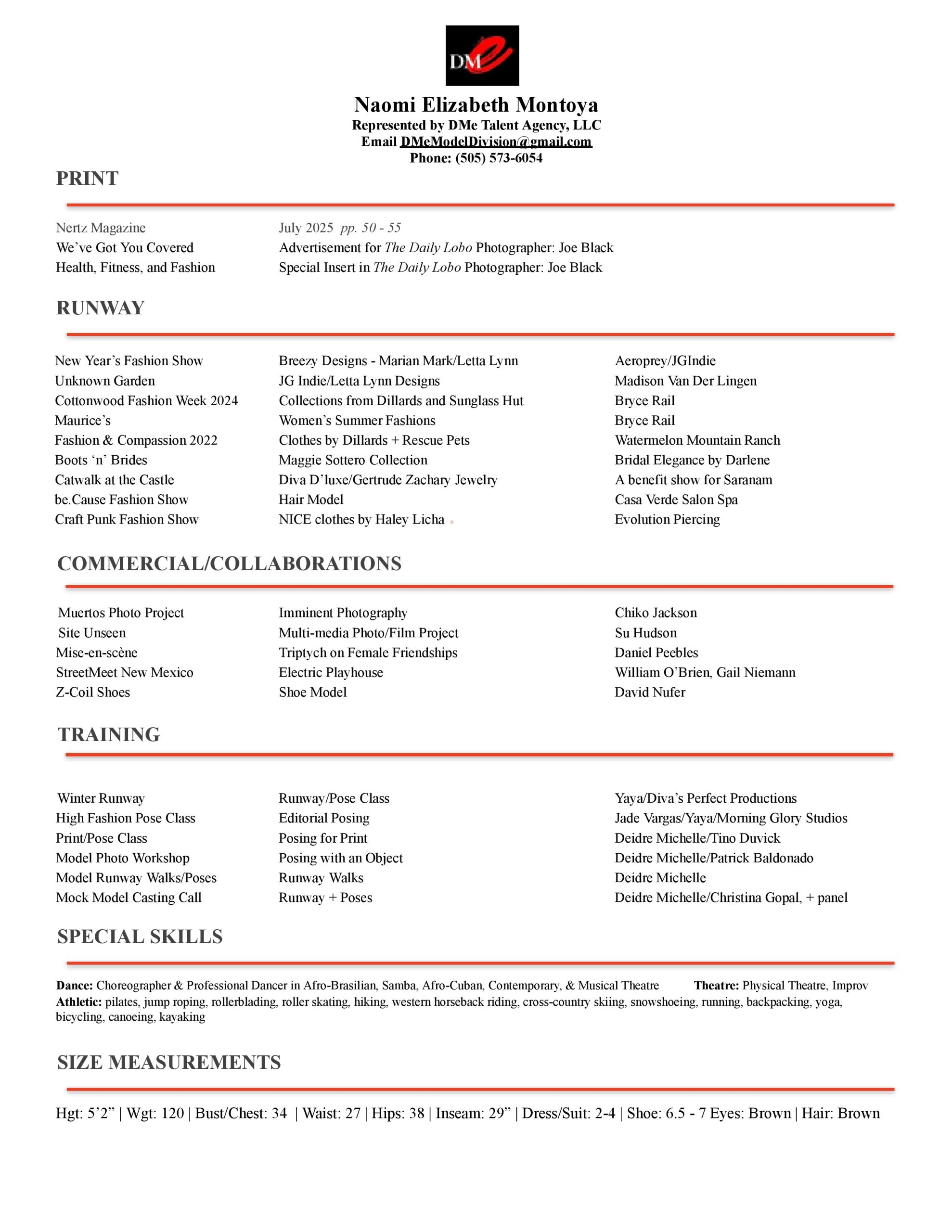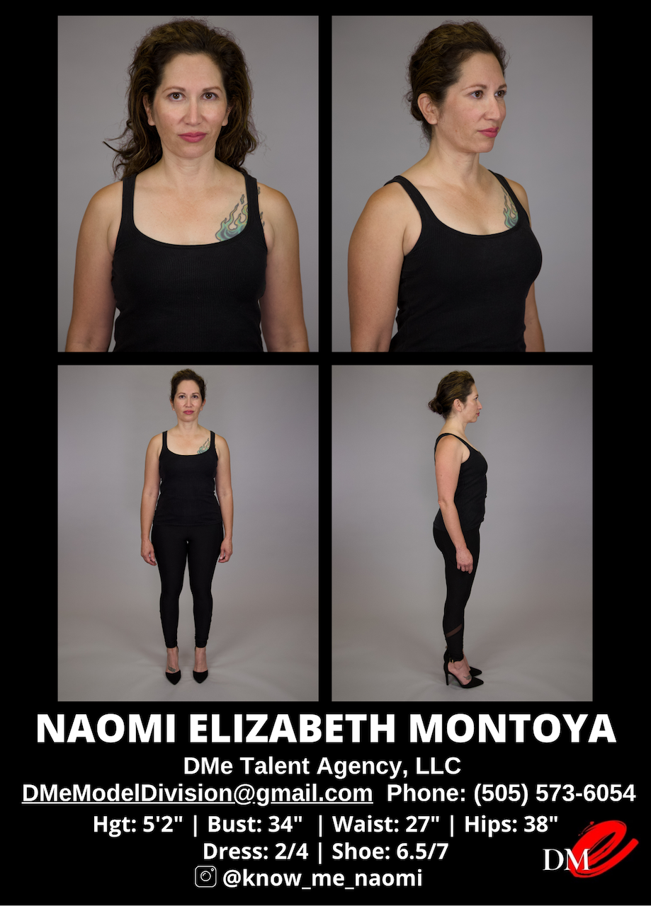 • Hgt: 5’2″, Wgt: 118#s, Bust 34″, Cup C, Waist: 27″, Hips: 36″, Inseam: 29″, Shoe: 6.5/7, Dress: 2/4, Hat: 6-5/8